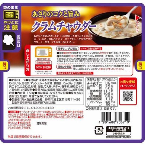 | 乳等を主要原料とする食品(国内製造)、じゃがいも、あさり、マッシュルーム水煮、濃縮乳、にんじん、小麦粉、貝エキス、たまねぎ、砂糖、食塩、でん粉、バター、香辛料、酵母エキス/乳化剤、pH調整剤 |