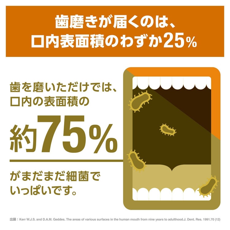 ・日常の歯磨きに加え、適量(約20ml)を口に含み、30秒程すすいでから吐き出します。水で口をすすぐ必要はありません。