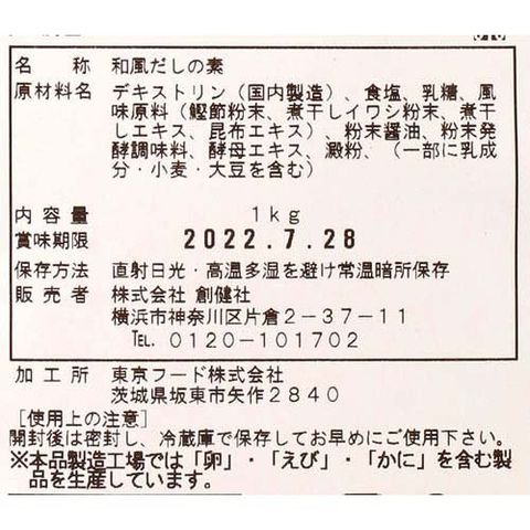 | デキストリン(国内製造)、食塩、乳糖、風味原料(鰹節粉末、煮干しイワシ粉末、煮干しエキス、昆布エキス)、粉末醤油、粉末発酵調味料、酵母エキス、澱粉、(一部に乳成分・小麦・大豆を含む) |