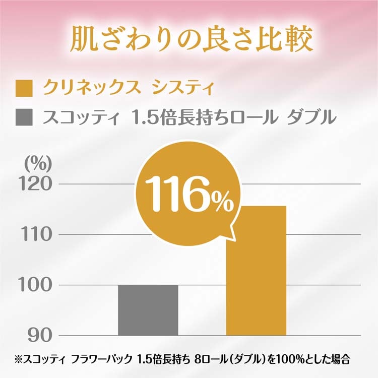 ●パルプ配合にこだわり、ふんわりなめらか。メーカー製品比116%※1) の肌ざわり。ふんわりとした厚みを生み出すマイクロエンボス加工を両面に施すことにより、真のやわらかさを追求しました。