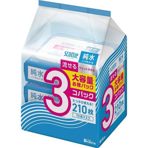 スコッティ 流せる ウェットタオル 純水 ノンアルコール ソフトパック (70枚×3個)