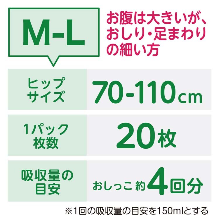 | 吸収量・・・おしっこ4回分(1回の排尿量を150ccとして) 適応サイズ・・・M-L:ヒップサイズ 70-110cm |