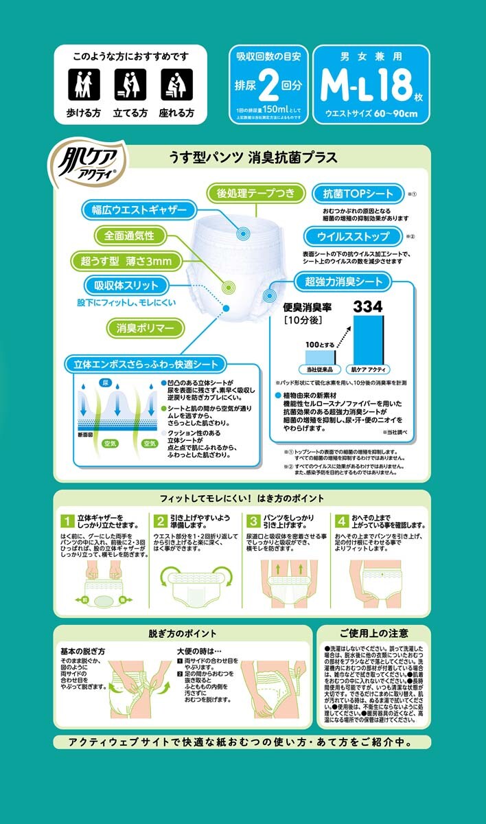 肌ケアアクティ 大人用おむつ うす型パンツ 消臭抗菌プラス 約2回分 M-L (18枚入)