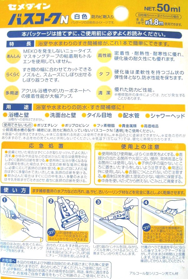 ●プラスチックへの密着性をアップさせた高性能タイプです。安心性能と、充てん補修材本来の基本性能をしっかり両立、進化したバスコークです。はみだし防止のマスキングテープ・ノズル・ヘラ・らくらく絞り器がセットになって、これ1本で、すぐ作業にとりかかれます。