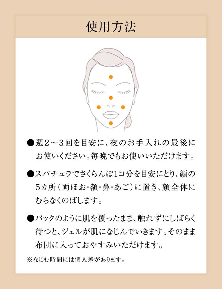・夜のお手入れの最後に、スパチュラでさくらんぼ1コ分を目安にとり、顔の5カ所(両ほお・額・鼻・あご)におき、顔全体にむらなくのばします。