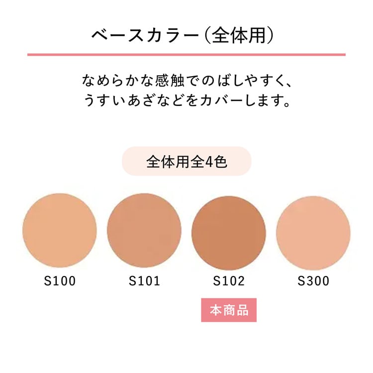 ●ベースカラー(全体用):なめらかな感触でのばしやすく、うすいあざなどをカバーします。