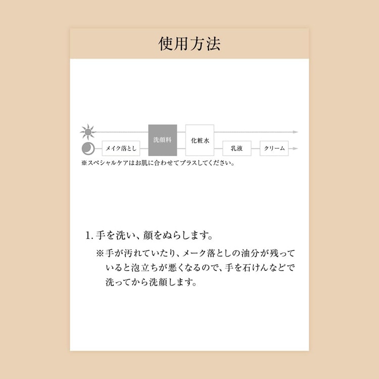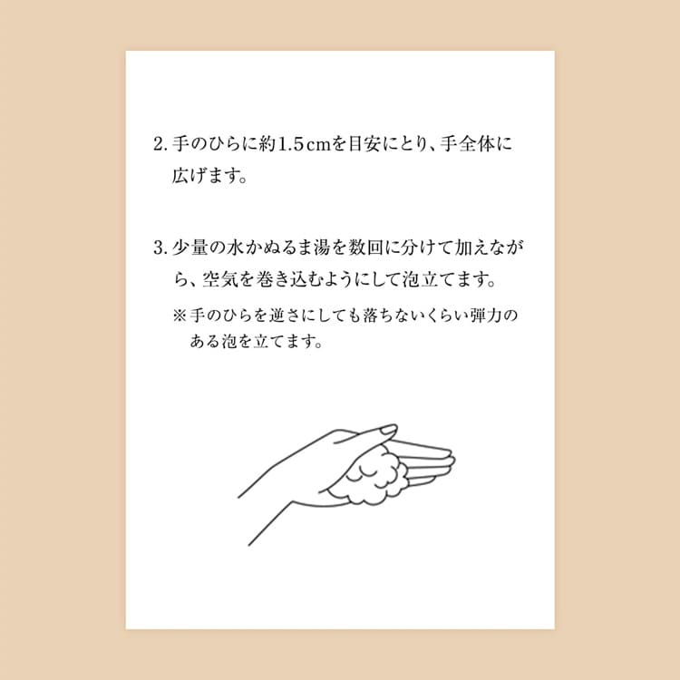 ・少量の水かぬるま湯を加えながら、顆粒を溶かすようによく泡立て、顔のすみずみまでていねいに洗います。