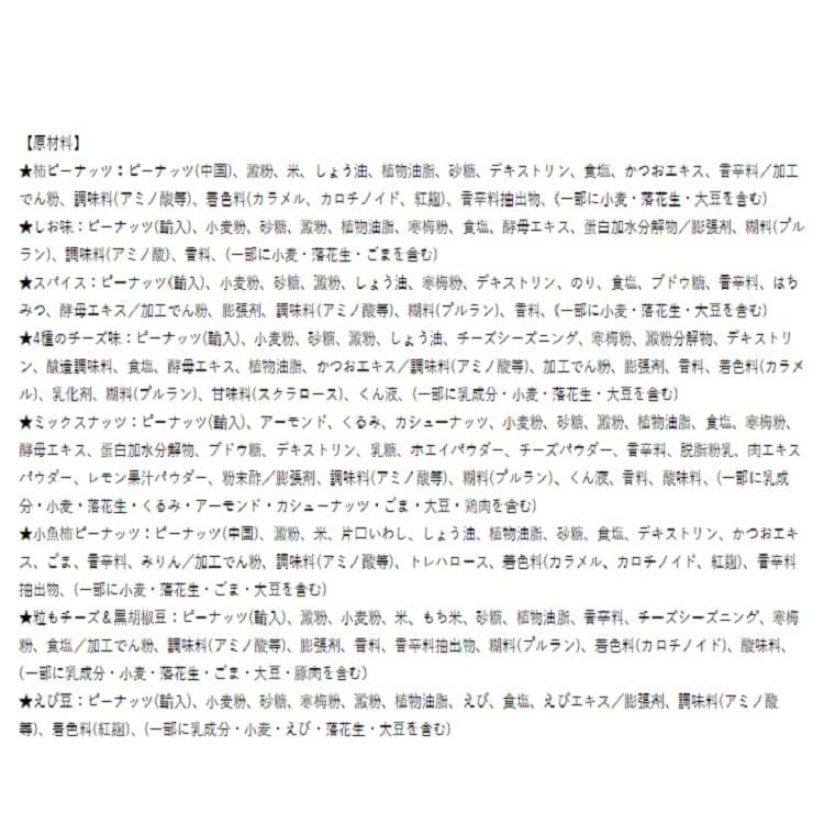 | ★柿ピーナッツ:小麦、落花生、大豆 ★しお味:小麦、落花生、ごま ★粒もチーズ&黒胡椒豆:乳、小麦、落花生、ごま、大豆、豚肉 ★ミックスナッツ:乳、小麦、落花生、くるみ、アーモンド、カシューナッツ、ごま、大豆、鶏肉 ★えび豆:乳、小麦、えび、落花生、大豆 ★スパイス:小麦、落花生、大豆 ★4種のチーズ味:乳、小麦、落花生、大豆 ★小魚柿ピーナッツ:小麦、落花生、ごま、大豆 |