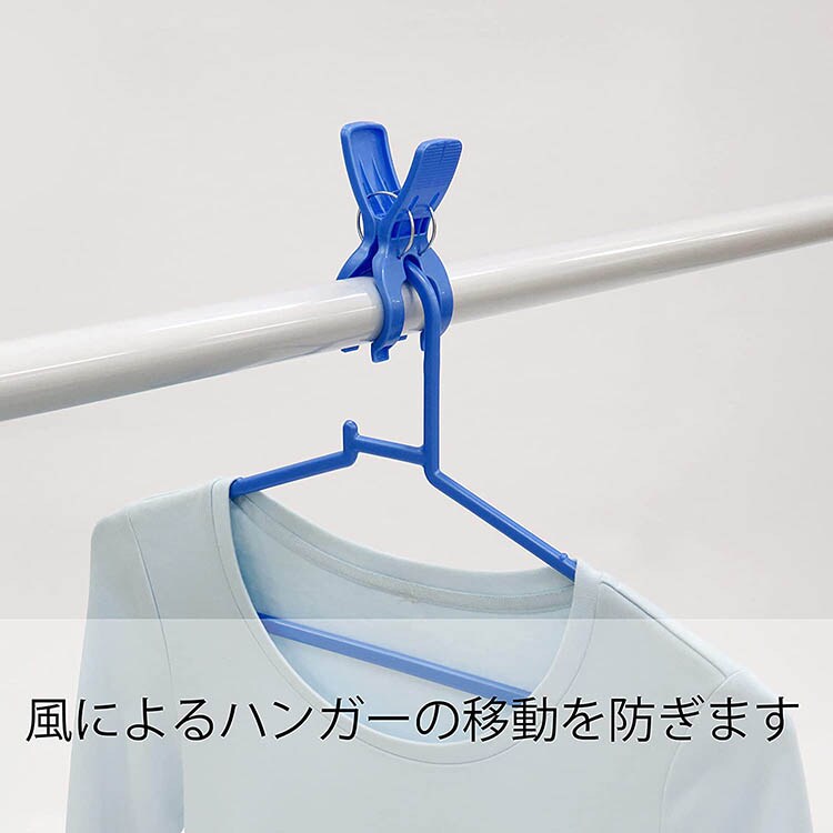 ●竿にかけた洗濯用ハンガーの上からまるごとはさめるので、ハンガーの固定にもお使いいただけます。