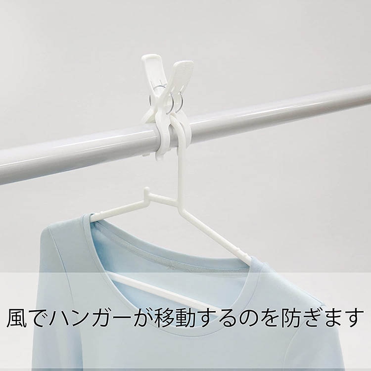 ●竿にかけた洗濯用ハンガーの上からまるごとはさめるので、ハンガーの固定にもお使いいただけます。