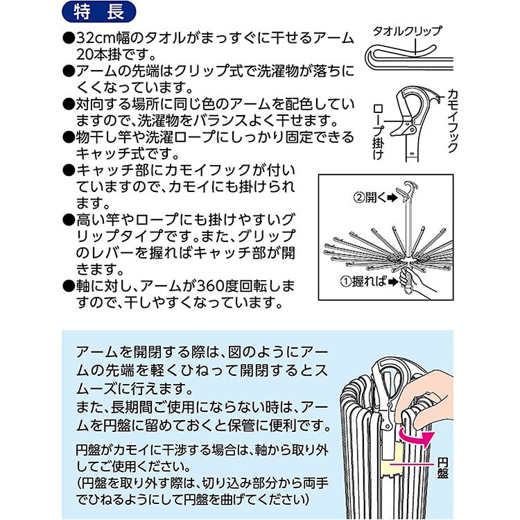 ●20本アームでたくさんのタオルなどが干せるので、美容院やサロンなどのお店の備品としても最適です。