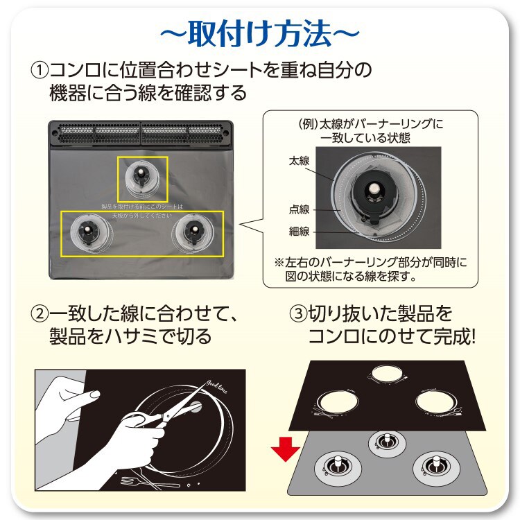 (3)切り抜いた製品を印刷面が上に来るようにコンロ天板にのせ、天板に密着させ、ゴトクを元の位置に戻し完成です。