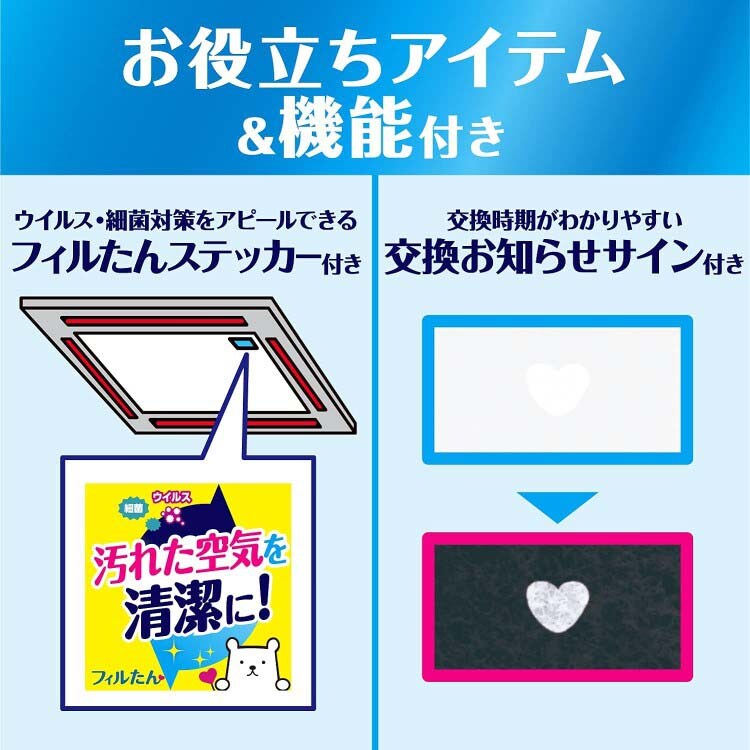 ・ウイルス・細菌対策をアピールできるフィルたんステッカーフィルターの上に貼り付けてください。天井埋込型エアコン本体に貼ると、のり残りする場合があります。