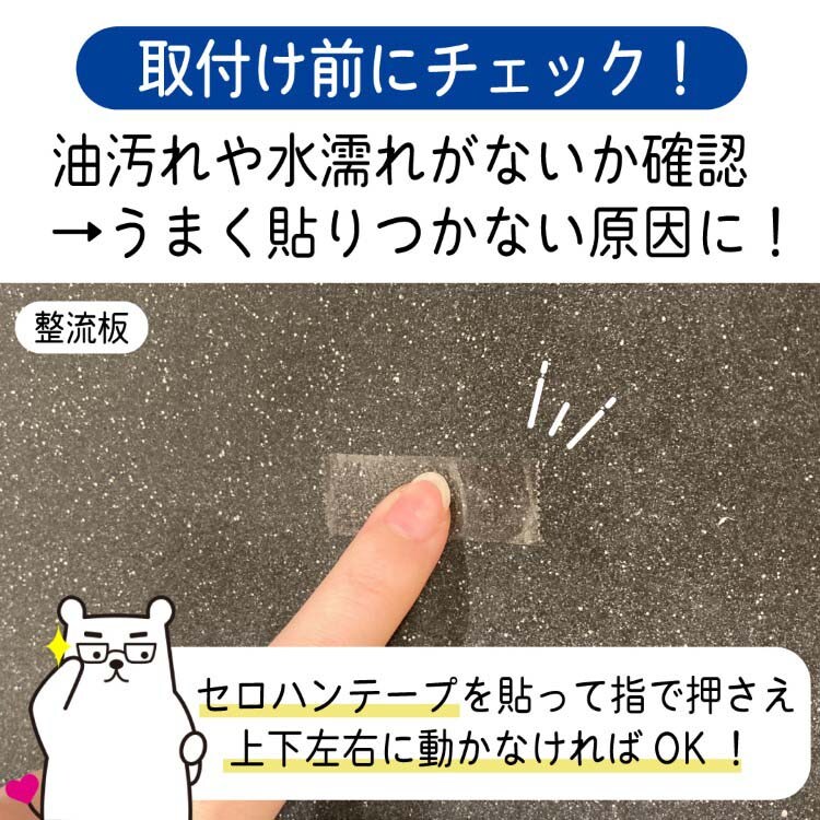 ・キッチンの温度が低い場合、貼り付きにくくなります。このような場合は、キッチンをあたたかくし、粘着加工部分をしっかり押さえるように取付けてください。