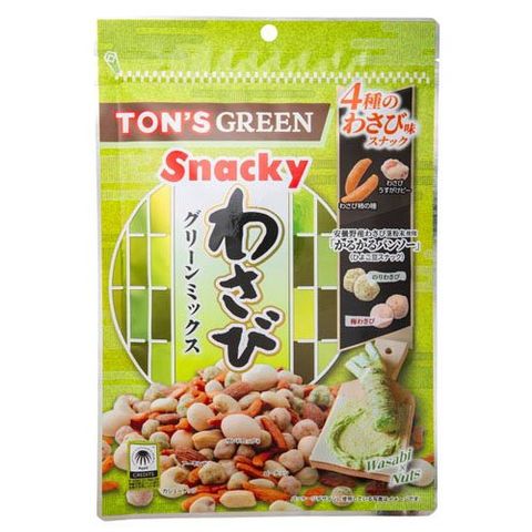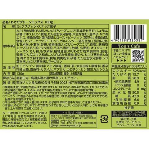| わさび柿の種(でん粉、米、わさびシーズニング(乳成分を含む)、しょうゆ、砂糖、デキストリン、食塩、たん白加水分解物(大豆を含む)、唐辛子、かつおエキス、植物油脂)(国内製造)、ローストピーナッツ(落花生、植物油脂、食塩)、カシューナッツ、アーモンド、ガルバンソー、落花生加工品(落花生、もち米粉、小麦粉、砂糖、植物油脂、わさびシーズニング、食塩)、寒梅粉ミックス(でん粉、もち米粉、うるち米粉)、砂糖、小麦粉、オイルコートレーズン、でん粉、もち米粉、植物油脂、のりわさび粉末調味料(食塩、砂糖、こんぶエキス粉末、たん白加水分解物、青のり、わさび茎粉末)、食塩、梅わさび粉末調味料(食塩、梅肉粉末、砂糖、たん白加水分解物、シソ葉粉末、わさび茎粉末)、マーガリン/加工デンプン、調味料(アミノ酸等)、香料(乳・大豆由来)、酸味料、香辛料抽出物、着色料(カラメル、パプリカ、カロチン)、リン酸三カルシウム |