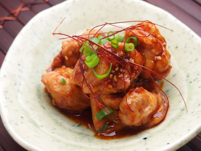 (4)鶏肉に火が通ったら、(2)を加えて炒め合わせ、器に盛り、万能ねぎを散らし、糸唐がらしを添える。