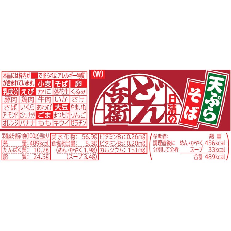 | 油揚げめん(小麦粉(国内製造)、そば粉、植物油脂、食塩、植物性たん白、しょうゆ、かつおぶし粉末、糖類)、かやく(天ぷら)、スープ(糖類、食塩、かつおぶし調味料、粉末しょうゆ、かつおぶし粉末、ねぎ、七味唐辛子、たん白加水分解物、こんぶ粉末、こんぶ調味料、植物油脂)/加工でん粉、調味料(アミノ酸等)、リン酸塩(Na)、炭酸Ca、カラメル色素、香料、酸化防止剤(ビタミンE)、カロチノイド色素、ベニコウジ色素、pH調整剤、チャ抽出物、ビタミンB2、ビタミンB1、(一部にえび・小麦・そば・卵・乳成分・ごま・大豆を含む) |
