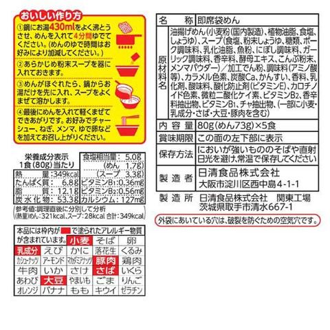 | 油揚げめん(小麦粉(国内製造)、植物油脂、食塩、しょうゆ)、スープ(食塩、粉末しょうゆ、糖類、ポーク調味料、乳化油脂、魚粉、にぼし調味料、ガーリック調味料、香辛料、酵母エキス、こんぶ粉末、メンマパウダー)/加工でん粉、調味料(アミノ酸等)、カラメル色素、炭酸Ca、かんすい、香料、乳化剤、酸味料、酸化防止剤(ビタミンE)、カロチノイド色素、微粒二酸化ケイ素、ビタミンB2、香辛料抽出物、ビタミンB1、チャ抽出物、(一部に小麦・乳成分・さば・大豆・豚肉を含む) |