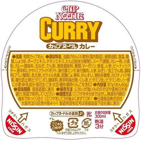 | 油揚げめん(小麦粉(国内製造)、植物油脂、食塩、糖類、しょうゆ、ポークエキス、チキンエキス、たん白加水分解物)、スープ(豚脂、カレー粉、小麦粉、カレー調味料、玉ねぎ、でん粉、香味調味料、糖類、マーガリン、食塩、人参、ピーナッツバター、香辛料)、かやく(フライドポテト、味付豚ミンチ、味付豚肉、人参、ねぎ)/加工でん粉、調味料(アミノ酸等)、乳化剤、カラメル色素、炭酸Ca、香料、かんすい、増粘多糖類、カロチノイド色素、酸化防止剤(ビタミンE)、酸味料、香辛料抽出物、くん液、ビタミンB2、ビタミンB1、(一部に小麦・卵・乳成分・落花生・ごま・大豆・鶏肉・豚肉・りんごを含む) |