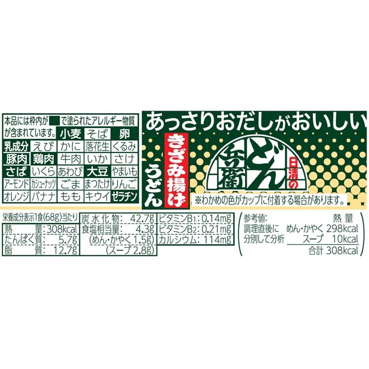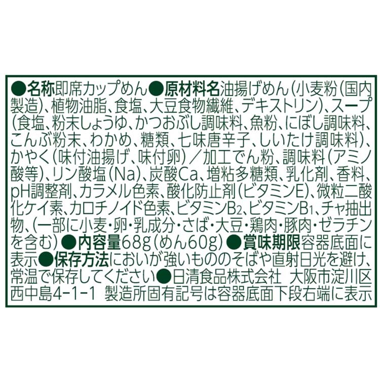 | 油揚げめん(小麦粉(国内製造)、植物油脂、食塩、大豆食物繊維、デキストリン)、スープ(食塩、粉末しょうゆ、かつおぶし調味料、魚粉、にぼし調味料、こんぶ粉末、わかめ、糖類、七味唐辛子、しいたけ調味料)、かやく(味付油揚げ、味付卵)/加工でん粉、調味料(アミノ酸等)、リン酸塩(Na)、炭酸Ca、増粘多糖類、乳化剤、香料、pH調整剤、カラメル色素、酸化防止剤(ビタミンE)、微粒二酸化ケイ素、カロチノイド色素、ビタミンB2、ビタミンB1、チャ抽出物、(一部に小麦・卵・乳成分・さば・大豆・鶏肉・豚肉・ゼラチンを含む) |