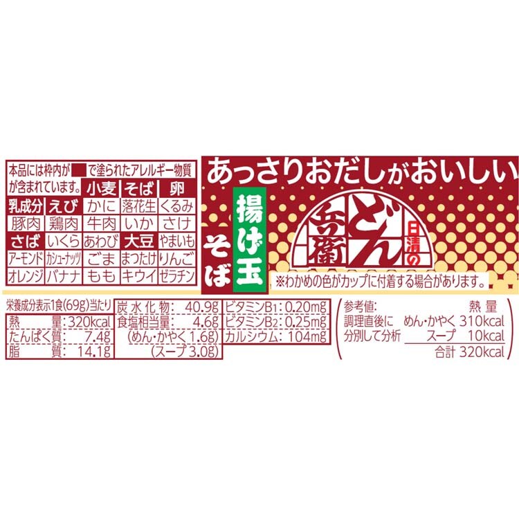 | 油揚げめん(小麦粉(国内製造)、そば粉、植物油脂、食塩、植物性たん白、しょうゆ)、スープ(糖類、食塩、かつおぶし調味料、粉末しょうゆ、魚粉、オニオン調味料、たん白加水分解物、デキストリン、わかめ、七味唐辛子、こんぶ粉末)、かやく(揚げ玉、かまぼこ)/加工でん粉、調味料(核酸等)、リン酸塩(Na)、カラメル色素、炭酸Ca、酸味料、香料、酸化防止剤(ビタミンE)、ベニコウジ色素、チャ抽出物、クチナシ色素、ビタミンB2、ビタミンB1、(一部にえび・小麦・そば・卵・乳成分・さば・大豆を含む) |