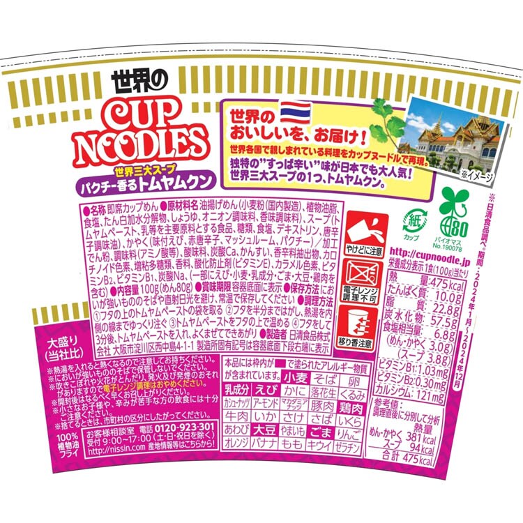 | 油揚げめん(小麦粉(国内製造)、植物油脂、食塩、たん白加水分解物、しょうゆ、オニオン調味料、香味調味料)、 スープ(トムヤムペースト、乳等を主要原料とする食品、糖類、食塩、デキストリン、唐辛子調味油)、 かやく(味付えび、赤唐辛子、マッシュルーム、パクチー)/加工でん粉、調味料(アミノ酸等)、酸味料、炭酸Ca、かんすい、香辛料抽出物、カロチノイド色素、増粘多糖類、香料、酸化防止剤(ビタミンE)、カラメル色素、 ビタミンB2、ビタミンB1、炭酸Na、(一部にえび・小麦・乳成分・ごま・大豆・鶏肉を含む) |