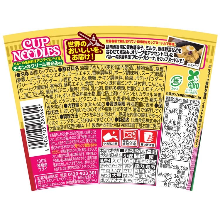 ●「美食の国」といわれるペルーの名物料理「アヒ・デ・ガジーナ」をカップヌードル流にアレンジ!クリーミーでチキンの旨味を凝縮したベースに黄色唐辛子とオリーブの風味を加えた異国情緒溢れる味わいです。