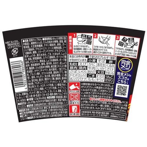 | めん(小麦粉(国内製造)、植物性たん白、たん白加水分解物、食塩、植物油脂、大豆食物繊維、チキン調味料、卵粉、ガーリック調味料、デキストリン)、ソース(植物油脂、ソース調味料、糖類、コラーゲンペプチド、デキストリン、粉末しょうゆ、還元水あめ、ごま、たまねぎ、しょうゆ、食塩、野菜調味料、スパイス調味料、ガーリック調味料、ドロマイト、香味油、しょうゆ調味料、ポーク調味料、香味調味料、酵母、香辛料、あおさ、紅しょうが、醸造酢、たん白加水分解物、納豆菌エキス入り食用油脂)、かやく(キャベツ、味付豚肉)/加工でん粉、グルコン酸K、カラメル色素、調味料(アミノ酸等)、香料、かんすい、乳化剤、増粘多糖類、リン酸Ca、塩化Mg、塩化K、環状オリゴ糖、酸味料、香辛料抽出物、アルギニン、リジン、グリセリン、V.C、酸化防止剤(V.E)、カロチノイド色素、リン酸塩(Na)、V.E、ピロリン酸鉄、ベニコウジ色素、ナイアシン、V.B6、炭酸Mg、パントテン酸Ca、V.B1、V.B2、V.A、葉酸、V.D、V.B12、(一部に小麦・卵・乳成分・ごま・大豆・鶏肉・豚肉・りんご・ゼラチンを含む) |