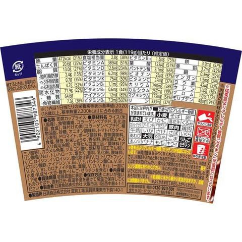 | 1食(119g)当たり エネルギー:472kcal、たんぱく質:20.6g、脂質:13g、炭水化物:71.9g、食塩相当量:2.8g、ビタミンB1:1.1mg、ビタミンB2:0.6mg、カルシウム:267mg |