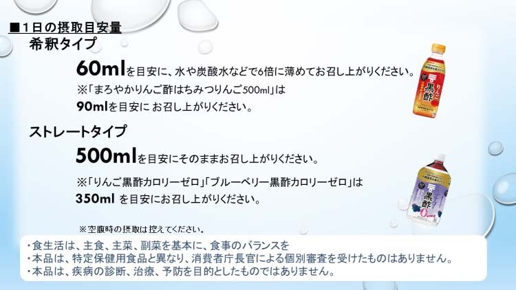届出表示:本品には食酢の主成分である酢酸が含まれます。酢酸には肥満気味の方の内臓脂肪を減少させる機能、日常生活で生じる運動程度(5~6METs)の一時的な疲労感を軽減する機能があることが報告されています。