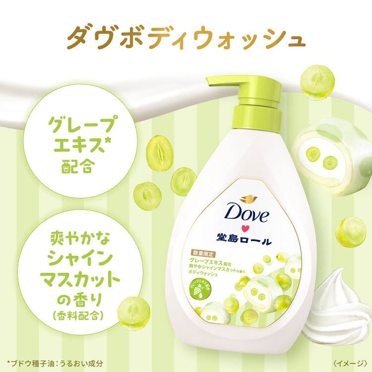●「堂島ロール」を再現した「ダヴ ふわとろクリーミースクラブ 堂島ロール」と、「季節の堂島ロール シャインマスカット」を再現した「ダヴ ボディウォッシュ 季節の堂島ロール シャインマスカット」も展開。お好きな製品と一緒に使ってください!