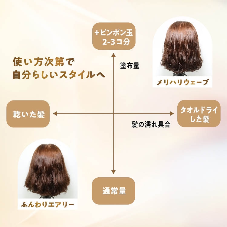 ・乾いた髪、タオルドライした髪に適量(セミロングでピンポン玉2~3コ)を、ウェーブを出したい部分になじませる。