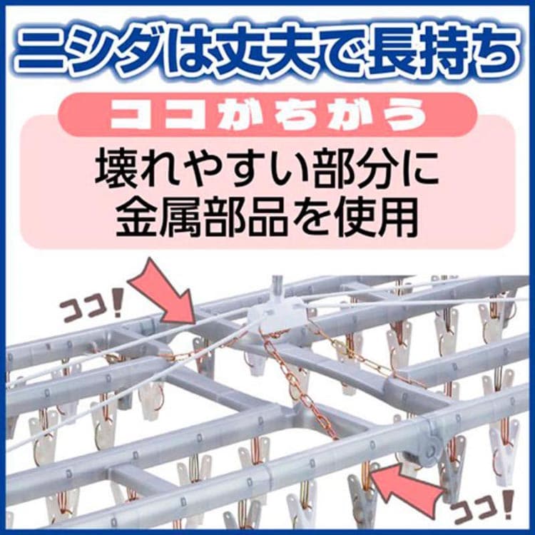 | 商品サイズ(約):W940×D340×H400mm 商品重量(約):1060g 本体・キャッチ部・ピンチ:ポリプロピレン ピンチ吊り:スチール・亜鉛めっき 枠吊り部:被膜鉄線 バネ:硬鋼線・亜鉛めっき 鎖:鋼線・亜鉛めっき 生産国:中国 |