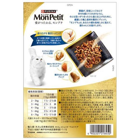 | 穀類(とうもろこし、とうもろこしたんぱく、小麦、米等)、肉類(チキンミール等)、動物性油脂、魚介類(まぐろ、かつお、かつお節、サーモン、かつおだしパウダー、いわしだしパウダー)、たんぱく加水分解物、フレーバーブレンド、ミネラル類(カルシウム、リン、カリウム、ナトリウム、クロライド、鉄、銅、マンガン、亜鉛、ヨウ素、セレン)、ビタミン類(A、E、K、B1、B2、パントテン酸、ナイアシン、B6、葉酸、ビオチン、B12、コリン)、アミノ酸類(メチオニン、タウリン)、着色料(カラメル色素、カロテノイド色素) |