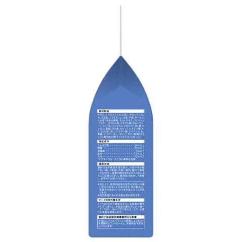 | チキン、とうもろこしたんぱく、チキンミール、米、大豆粉、とうもろこし、小麦、牛脂、サーモン、たんぱく加水分解物、モルトエキス、フィッシュパウダー、ほうれん草、ミネラル類(カルシウム、リン、カリウム、ナトリウム、クロライド、鉄、銅、マンガン、亜鉛、ヨウ素、セレン)、ビタミン類(A、D、E、K、B1、B2、パントテン酸、ナイアシン、B6、葉酸、ビオチン、B12、コリン)、アミノ酸類(タウリン)、酸化防止剤(ミックストコフェロール) |