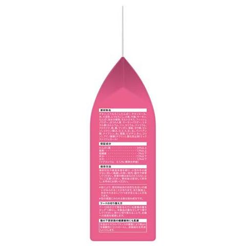 | チキン、とうもろこしたんぱく、チキンミール、米、大豆粉、とうもろこし、小麦、牛脂、サーモン、たんぱく加水分解物、モルトエキス、フィッシュパウダー、ほうれん草、サーモンパウダー、ミネラル類(カルシウム、リン、カリウム、ナトリウム、クロライド、鉄、銅、マンガン、亜鉛、ヨウ素、セレン)、ビタミン類(A、D、E、K、B1、B2、パントテン酸、ナイアシン、B6、葉酸、ビオチン、B12、コリン)、アミノ酸類(タウリン)、酸化防止剤(ミックストコフェロール) |