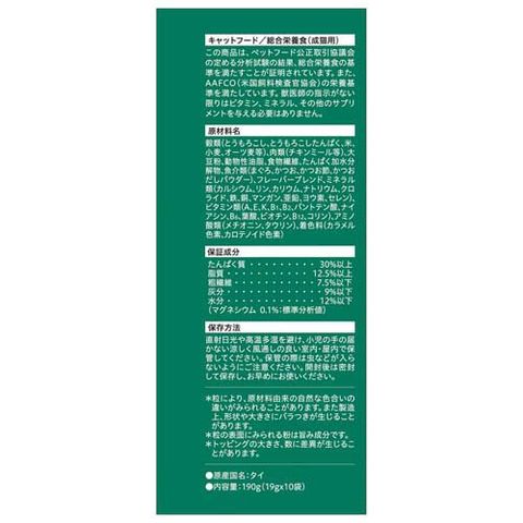 | 穀類(とうもろこし、とうもろこしたんぱく、米、小麦、オーツ麦等)、肉類(チキンミール等)、大豆粉、動物性油脂、食物繊維、たんぱく加水分解物、魚介類(まぐろ、かつお、かつお節、かつおだしパウダー)、フレーバーブレンド、ミネラル類(カルシウム、リン、カリウム、ナトリウム、クロライド、鉄、銅、マンガン、亜鉛、ヨウ素、セレン)、ビタミン類(A、E、K、B1、B2、パントテン酸、ナイアシン、B6、葉酸、ビオチン、B12、コリン)、アミノ酸類(メチオニン、タウリン)、着色料(カラメル色素、カロテノイド色素) |