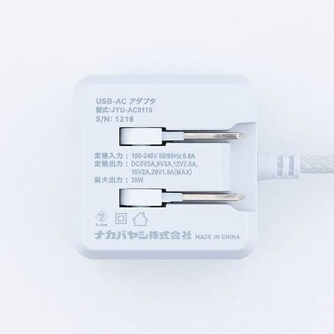 | 本体寸法/重量:約W39xD39xH38mm(※本体サイズ、プラグ収納時)/55g(本体のみ) 材質:PC 対応機種:USB-PD充電対応PC、MacBookシリーズ、タブレット、スマートフォン 充電規格:USB PD3.0/USB BC1.2 入力:AC100V~240V 定格容量:30W 出力電圧:5V3A/9V3A/12V2.5A/15V2A/20V1.5A |