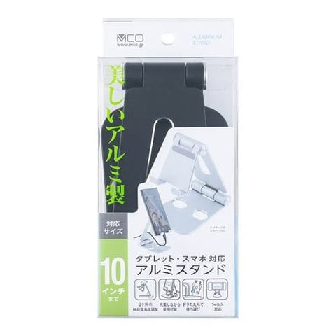 | 本体寸法:使用時/W76×H130×D105mm、折りたたみ時/W76×H18×D130mm(突起部除く) 重量:約185g 対応端末サイズ:10インチまでのタブレット・スマートフォン(厚み14mmまで)、Nintendo Switch 材質:アルミ合金、シリコン |