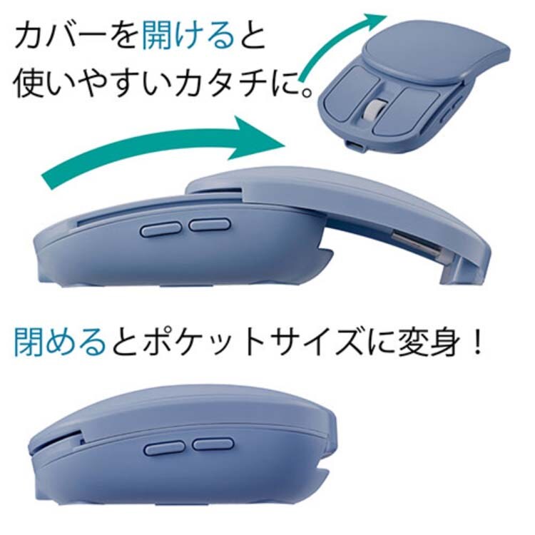 ●閉めて持ち運び、開いてすぐに使えるモバイルマウス。ボタンをカバーする構造で持ち運び時の誤操作を防ぎます。
