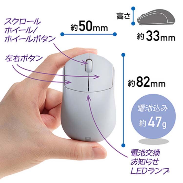 ●標準サイズマウスより約4割軽い。繊細な操作に応える静音ミニマウス。電池込みでわずか47g。