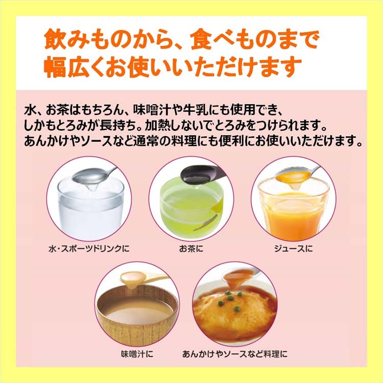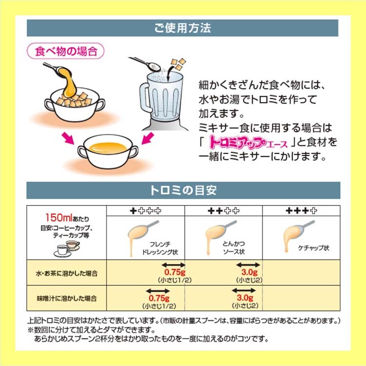 2.溶解後、1分-2分でトロミがつきますが、加える食品の種類、温度、量によってトロミが安定するまで時間がややかかる場合もあります。入れすぎると、トロミがつきすぎて飲み込みにくくなることがありますので、十分にご注意ください。