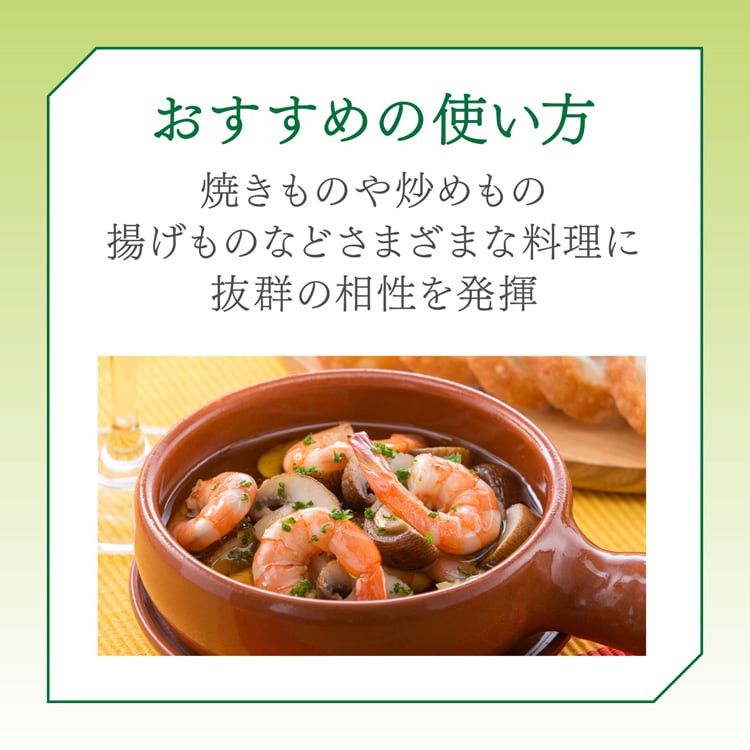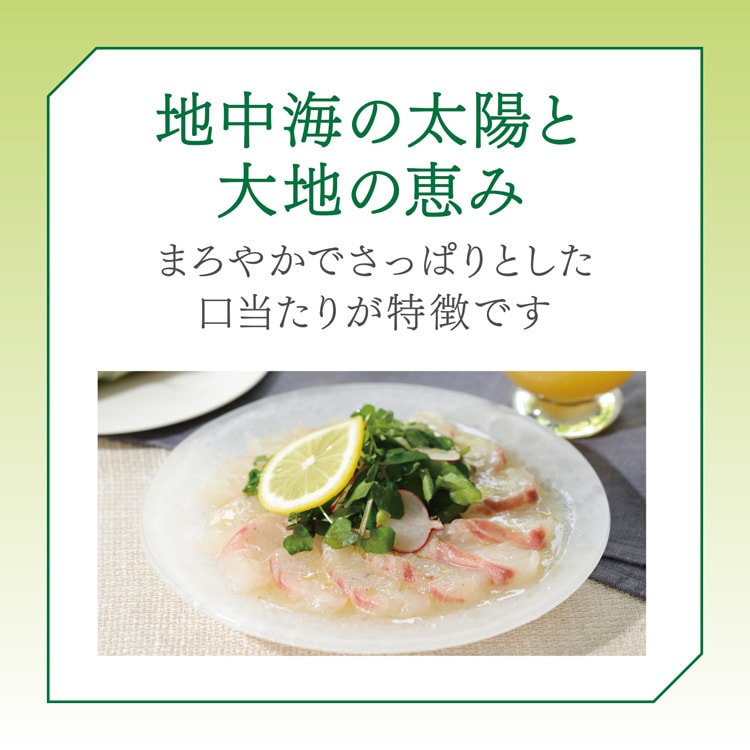 ●新鮮なオリーブの香りと味わいはそのままに、まろやかでさっぱりとした口当たりが特長です。