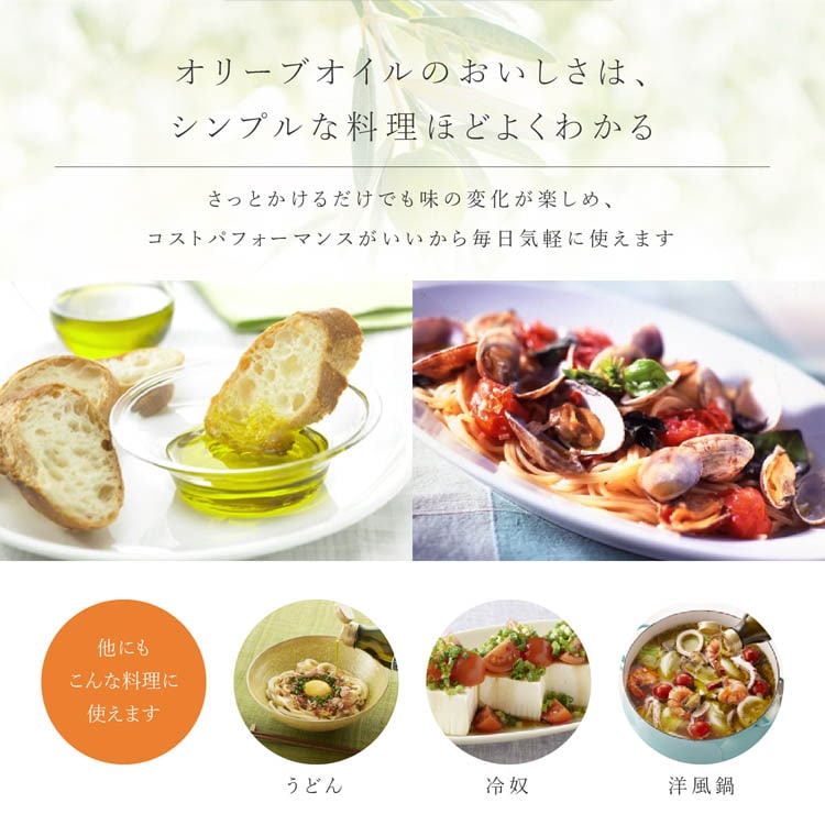 ●BOSCOエキストラバージンオリーブオイルは、料理の味をひき立てるフレッシュな風味が特長です。