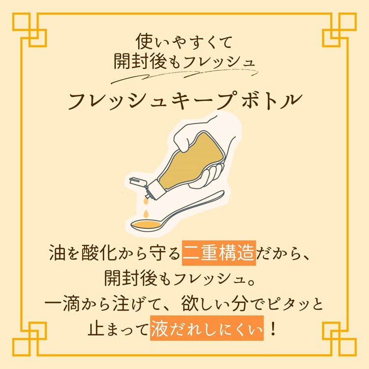 ●またオイルを酸化から防ぐフレッシュキープボトルだから開封後もフレッシュ。