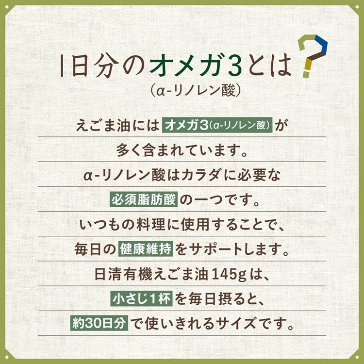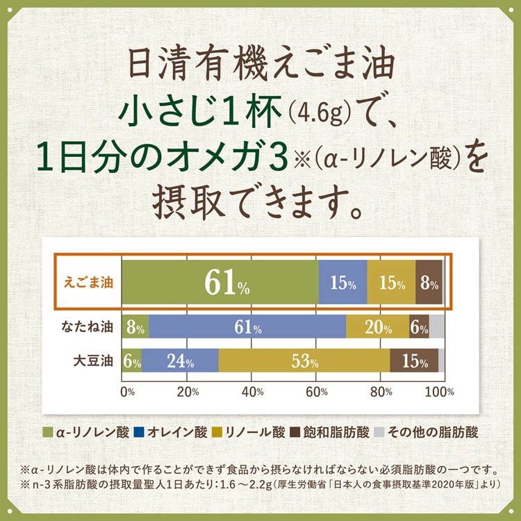 ●小さじ1杯に1日分のオメガ3(α-リノレン酸) (※1)※1: n-3 系脂肪酸の摂取目安量成人1日あたり: 1.6~2.2g(厚生労働省「日本人の食事摂取基準 (2020 年版)」より)