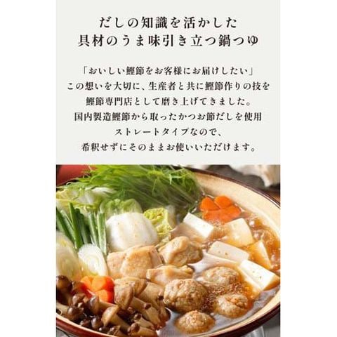 ●創業1699年、江戸時代から続く鰹節専門店・にんべんが、国内製造の鰹節を使用し、これまで築いてきた「だし」の知識をいかして作り上げた「鍋つゆ」です。