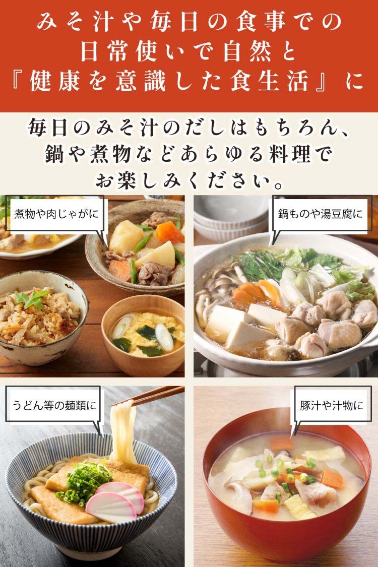 ●「香りが良く味わい深い旨み、みそ汁への日常使いで「健康を意識した食生活」を」みその風味に負けないしっかりとした旨みと豊かな香りのだしで、普段のみそ汁が美味しさを引き立てます!毎日のみそ汁のだしはもちろん、鍋や煮物などあらゆる料理でお楽しみください。