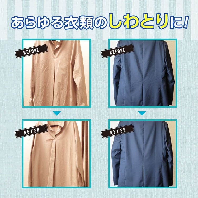 ●着用シワ、収納シワなどの衣類の「気になるシワ」にスプレーして手で伸ばすだけで、シワがスッキリとれます。