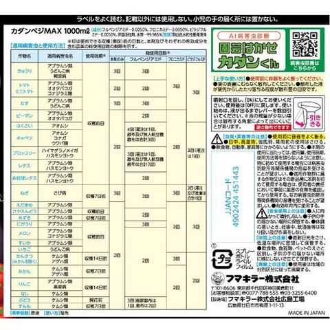 ●また、1本でさまざまな野菜・果樹と病害虫に使えるので、何本も薬剤を買いそろえる必要がありません。